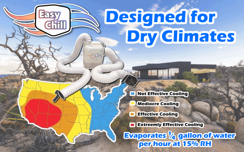 The Easy Chill is designed for shift-pods, yurts, RVs, campers, and canvas tents. With its flexible intake tube, cold air output tube, and screen-mounted exhaust fan, it ensures optimal airflow, which is crucial for evaporative cooling.