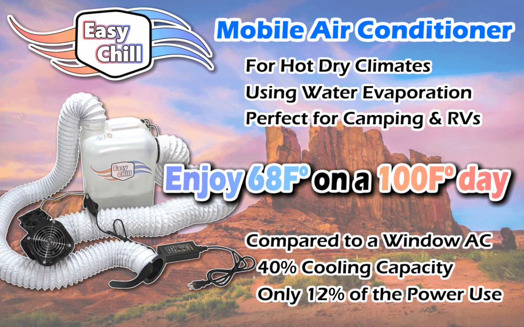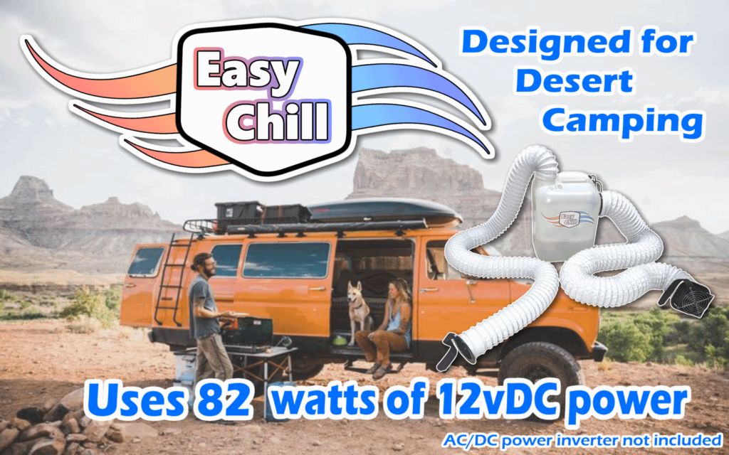 Enjoy a cold breeze at the hottest part of the day. The Easy Chill can reduce the air temperature from 100F to 68F in desert climates with less then 10% relative humidity. Perfect for campers, RVs and small rooms. Comes with a one year part replacement warranty. You will be impressed with it’s cooling performance. )'(